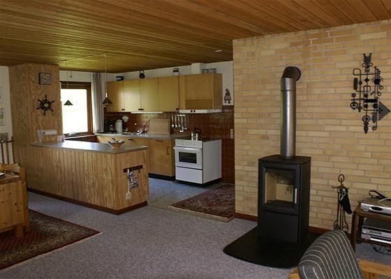 Sommerhuset er indrettet med stor lyd stue med brændeovn og udgang til stor overdækket terrasse. Stuen er i åben forbindelse med spiseafdeling og dejligt køkken i lys eg. Pænt badeværelse med håndvask og seperat toilet. 2 gode værelser, det ene med køjer og begge med skab. Stort soveværelse med skabe.