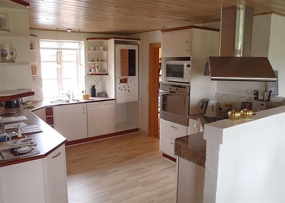 I selve boligen er der baggang/bryggers. Køkken/alrum med halvsvingstrappe til loftsetagen samt udgang til sydvendt terrasse - køkkeninventar er Invita fra 1996 samt nyere trægulv af asketræsparket/lamel. Lofterne er træbeklædt overalt. Stor spisestue med ludet trægulv. Entre med klinkegulv uden gulvvarme. Fra entre er der adgang til værelse med trægulv af asketræsparket/lamel. Desuden badeværelse.