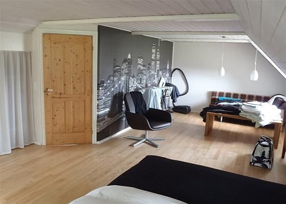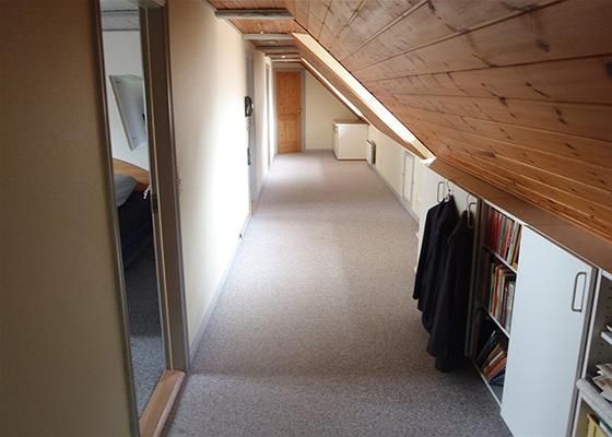 Loftsetagen er fuldt udnyttet med lang gang. Stort soveværelse. Badeværelse med bruser og gulvvarme. Stort værelse, som evt. kan deles i 2.