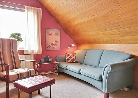 Den godt udnyttede 1. sal har lille depotrum, 3 værelser, soveværelse og badeværelse med toilet og brus.
