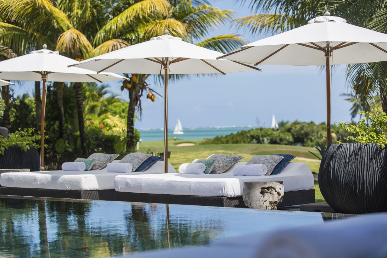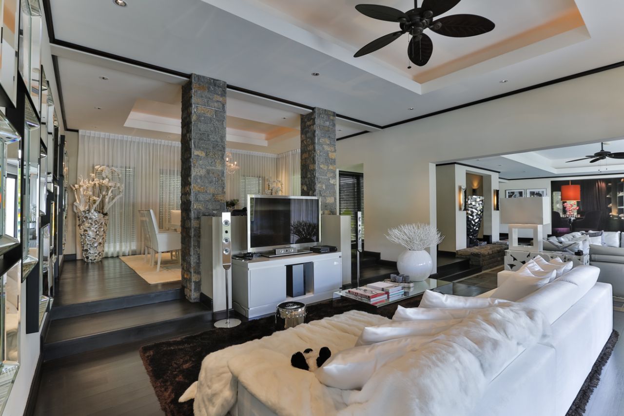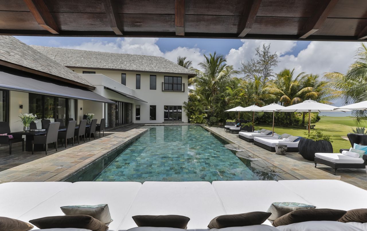 Villa in the new Mauritian style with an area of 485 m2 with a large terrace of 120 m2, on a plot of 2002 m2, furnished with a living space and an infinity pool. The side wing, composed of 3 bedrooms en suite and a large living room, offers a view overlooking the terrace, the garden, golf and the sea.