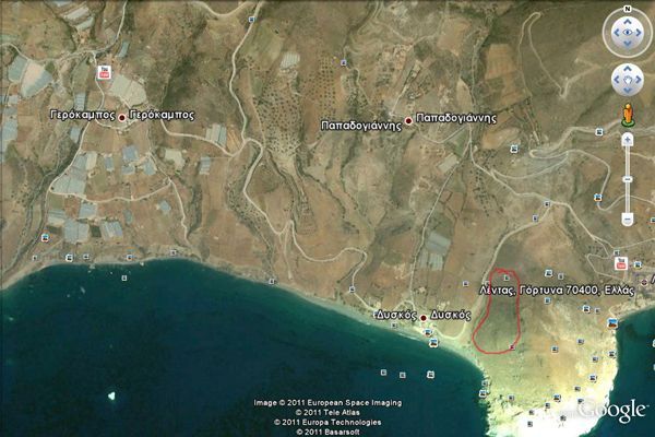 Das landwirtschaftliche Gelande hat Hanglage mit Meerblick und verlauft parallel zum Hauptstrasse. Es gibt einen Wasseranschluss, aber keinen Strom. Der nachstgelegene Ort ist Antiskari, der nur 10 Autominuten entfernt liegt. Zum Strand von Lendas, den Tavernen und Cafeterias ist es auch nur eine kurze Strecke.