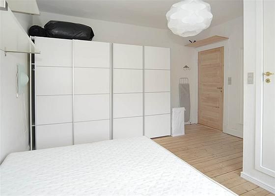 Der er afhøvlede trægulve og højt til loftet i gang stue og soveværelse. Køkkenet har parketgulv.
