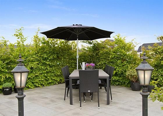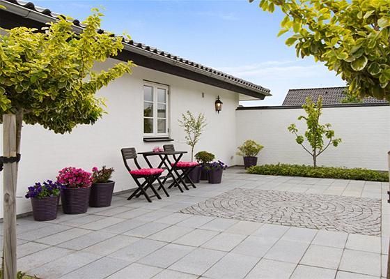 Haveanlæg og udenoms arealer er et kapitel for sig. Flotte farver på træer, buske og blomster pryder haven, som du i ro og mag kan sidde og betragte fra en af de hyggelige lækroge og terrasser - selv på en regnvejrsdag, hvor du blot kryber i ly på den dejlige overdækkede terrasse. Og trænger du til en stund for dig selv, så napper du blot en lille lur i hængekøjen bagerst i haven.