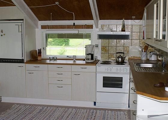 Det helt centrale rum i sommerhuset er stuen, som også er i åben forbindelse med pænt køkken med lyse skabe. Stuen har loft til kip med fritlagte bjælker og fra et stort loftvindue kommer der masser af sollys ind i stuen. Der er udgang til en stor overdækket og vestvendt terrasse. Stuen er udover en stor brændeovn også udstyrret med en varmeveksler der kan give varme om vinteren og køle om sommeren.