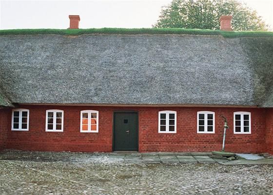 Stuehus og stald/lade er 4 sammenbyggede længer med 2 porte ind til en indvendig gårdsplads med pigsten.