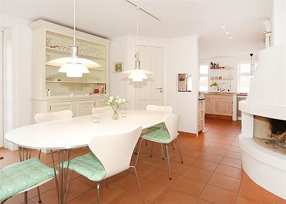 køkkenelementer i hvidskuret fyr og komfurniche, terracotta-farvet, rustikt klinkegulv og en oveflod af kvalitets-hvidevarer samt udgang til terrasse og haven via dobbelt fransk dør. her er der også flot hvidt loft med stuk.