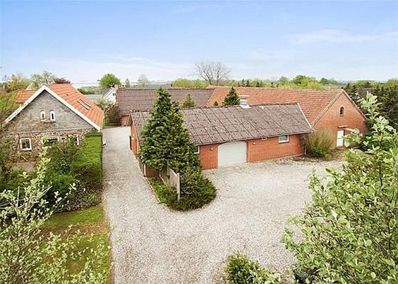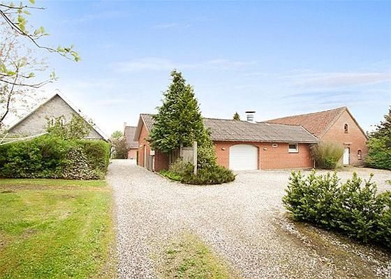 Er indrettet med dobbelt garage, lade, værksted og isoleret gildesal/anneks med the køkken og toilet.