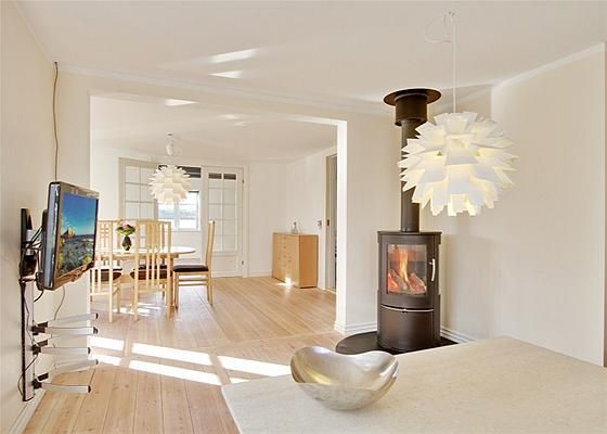 Opholdsstue med trægulv og brændeovn samt dobbeltdøre til terrassen