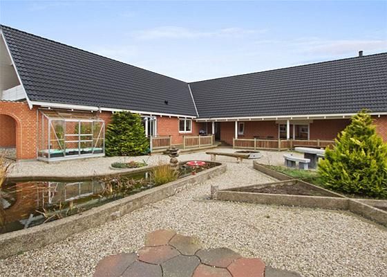 Stor velindrettet gårdhave med siddekroge, terrasser, drivhus, rindende vand og bassin med fisk. Fjernbetjente lamper.