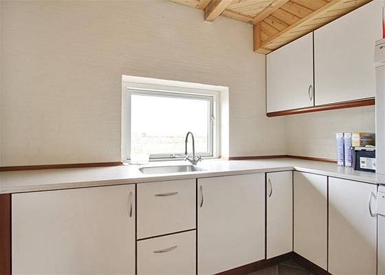 Fra entrren er der yderligere adgang til badeværelse med brus, stort værelse og indgang til det store lyse køkken åbent mod spiseafdeling og fjernsynsstue.