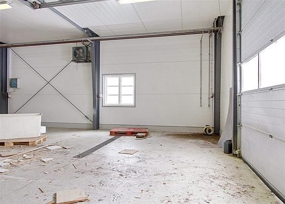 Hallen er p.t. opdelt i flere afdelinger, herunder godt isoleret værksted med egen portindkørsel. Hallen vil dog også kunne ændres til et stort rum.