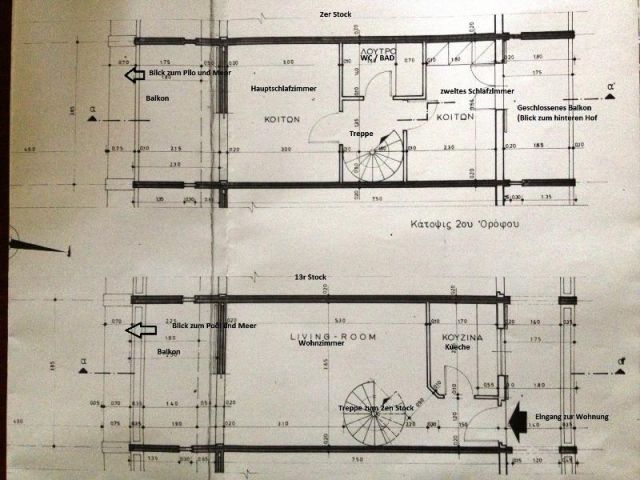 ? Beschreibung der Ferienwohnung: sie befindet im 1en/2en Stock des Wohnblocks, Eingang vom 1en Stock. Im 1en Stock: Küche, Wohnzimmer, Balkon mit Ausblick zum Swimming Pool und Meer, Treppe zum 2en Stock. Im 2en Stock: Bad mit kleiner Badewanne, 1 Hauptschlafzimmer mit Balkon mit Ausblick zum Swimming Pool und Meer, 1 Schlafzimmer mit geschlossenem Balkon.