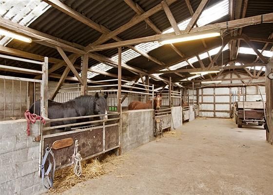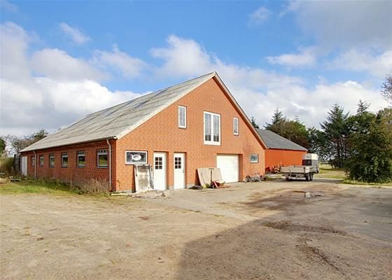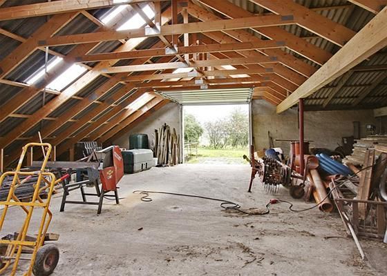 Stalden er indrettet med 6 hestebokse, saddelrum samt plads til oplag af foder. Herudover stort værksted med plant gulv samt aut. port, lade samt stor garage.