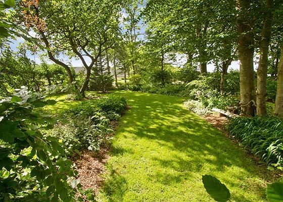 Ejendommen er omkranset af en prydhave med græsgange og flotte træer og det hele kan nydes fra husets udestue.