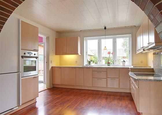 Indrettet med: Entre med klinkegulv. Stort lyst badeværelse med bruseniche. Lyst køkken i åben forbindelse til alrum med spiseplads og udgang til udestuen. Stue med vindeltrappe til 1. sal.