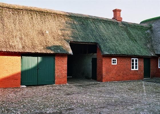 Stuehus og stald/lade er 4 sammenbyggede længer med 2 porte ind til en indvendig gårdsplads med pigsten.