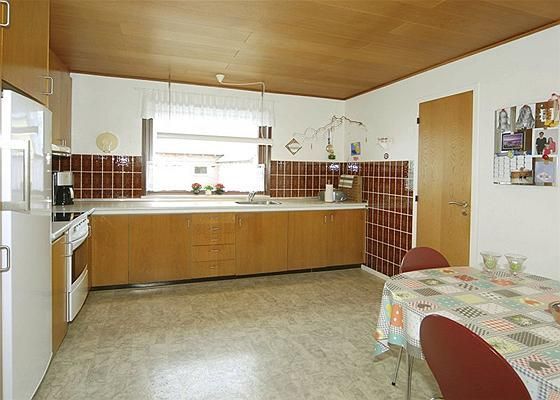 Fritliggende gulstens stuehus med et boligareal på 150 kvm i et plan med eternittag.