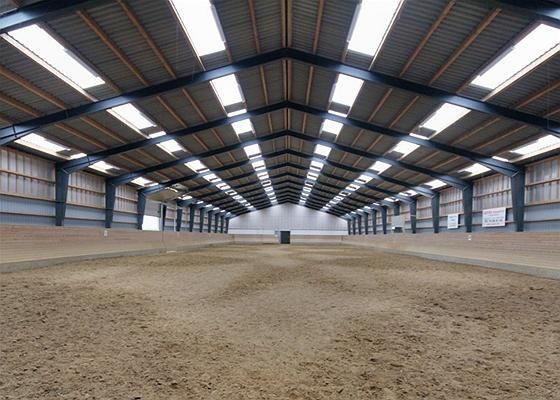 I den midterste del er der ridehal med internationale mål, med adgang direkte fra klinik og stald, samt stor port i siden.
