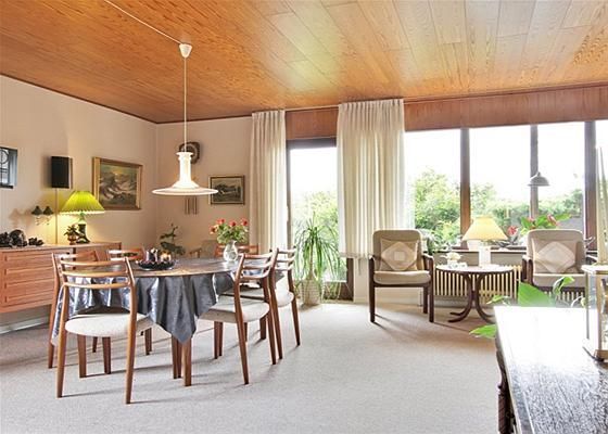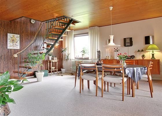 Direkte adgang til terrasse fra vinkelstuen og flot trappeopgang til yderligere en stue på 1. salen.
