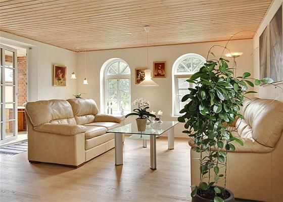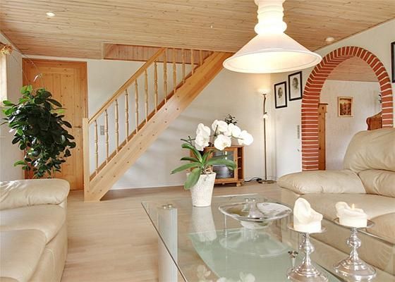 Gennem køkkenet indgang til både værelse og spisestue. Fra spisestuen direkte åbning til stor lys daglig/fjernsynsstue med adgang til stor træterrasse og afgang via trappe til 1. salen med stor repos og værelse.