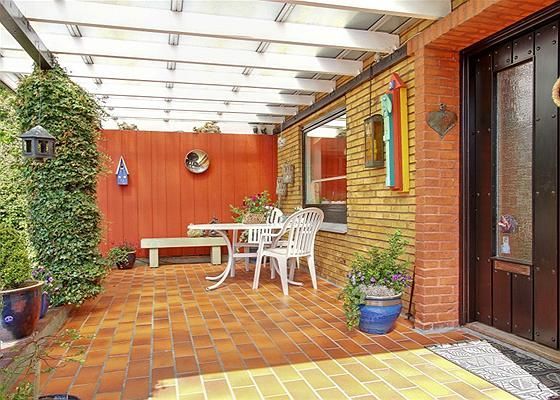 Huset fremstår med ydermur i gul mursten, med nyere stål-tag og tagrender på bygningen.